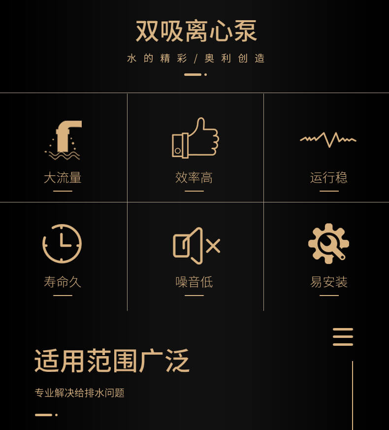 ALNS型雙吸泵為新一代高效節(jié)能單級雙吸中開式離心泵,主要適用于自來水廠、空調(diào)循環(huán)用水、供熱管網(wǎng)系統(tǒng)、建筑供水、灌溉、排水泵站、電廠、工業(yè)供水系統(tǒng)、消防系統(tǒng)、船舶工業(yè)、礦山給排水等輸送液體的場合,是SH、S、SA、SAP型中開雙吸泵的全面換代產(chǎn)品,具有高效節(jié)能、運(yùn)行穩(wěn)定、外觀優(yōu)美、壽命長久等特點。