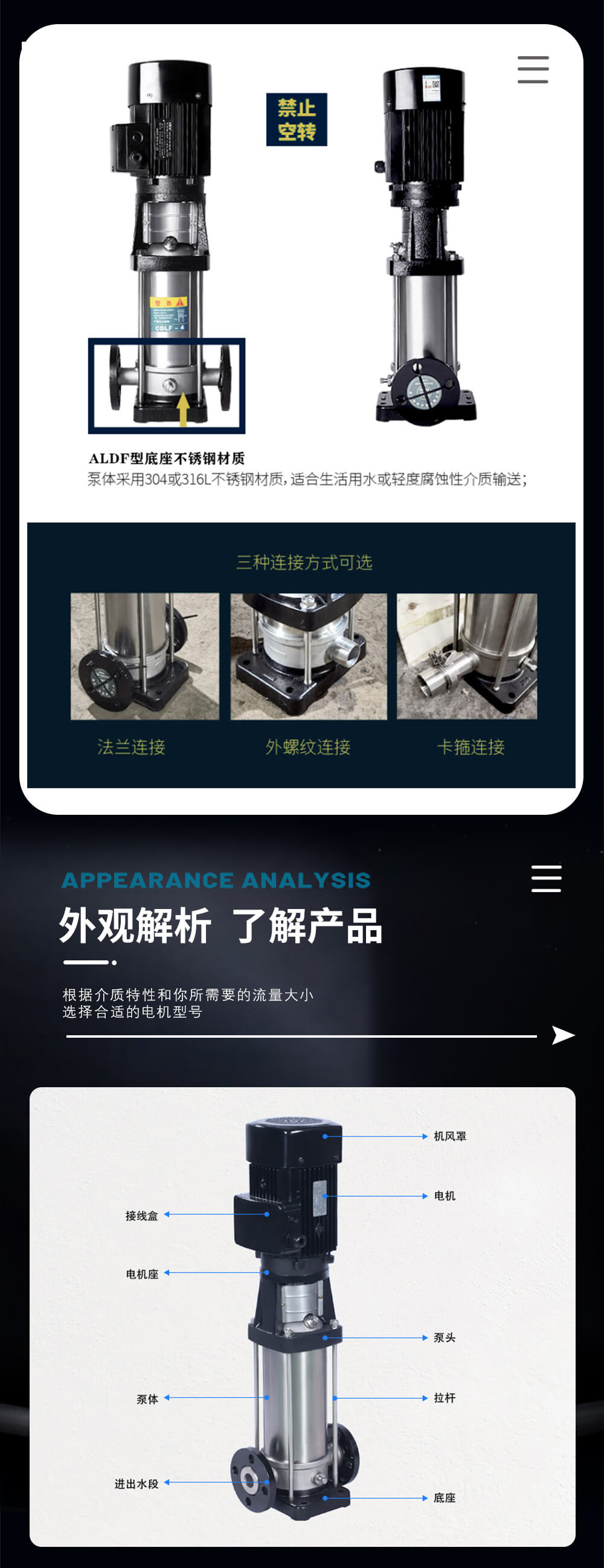 ALDF系列輕型不銹鋼立式多級(jí)離心泵是吸取了國內(nèi)外先進(jìn)技術(shù)而設(shè)計(jì)制造的非自吸立式多級(jí)離心泵,采用標(biāo)準(zhǔn)立式電機(jī)和快裝式機(jī)械密封,更換非常方便。泵的過流部分均采用不銹鋼(304\316)材料制成,可適用于輕度腐蝕性介質(zhì)。該產(chǎn)品可替代國外CR、CRN等同類產(chǎn)品。產(chǎn)品投放市場(chǎng)后,以其高效節(jié)能、質(zhì)量可靠、使用范圍廣等特點(diǎn),深受廣大用戶的喜愛。