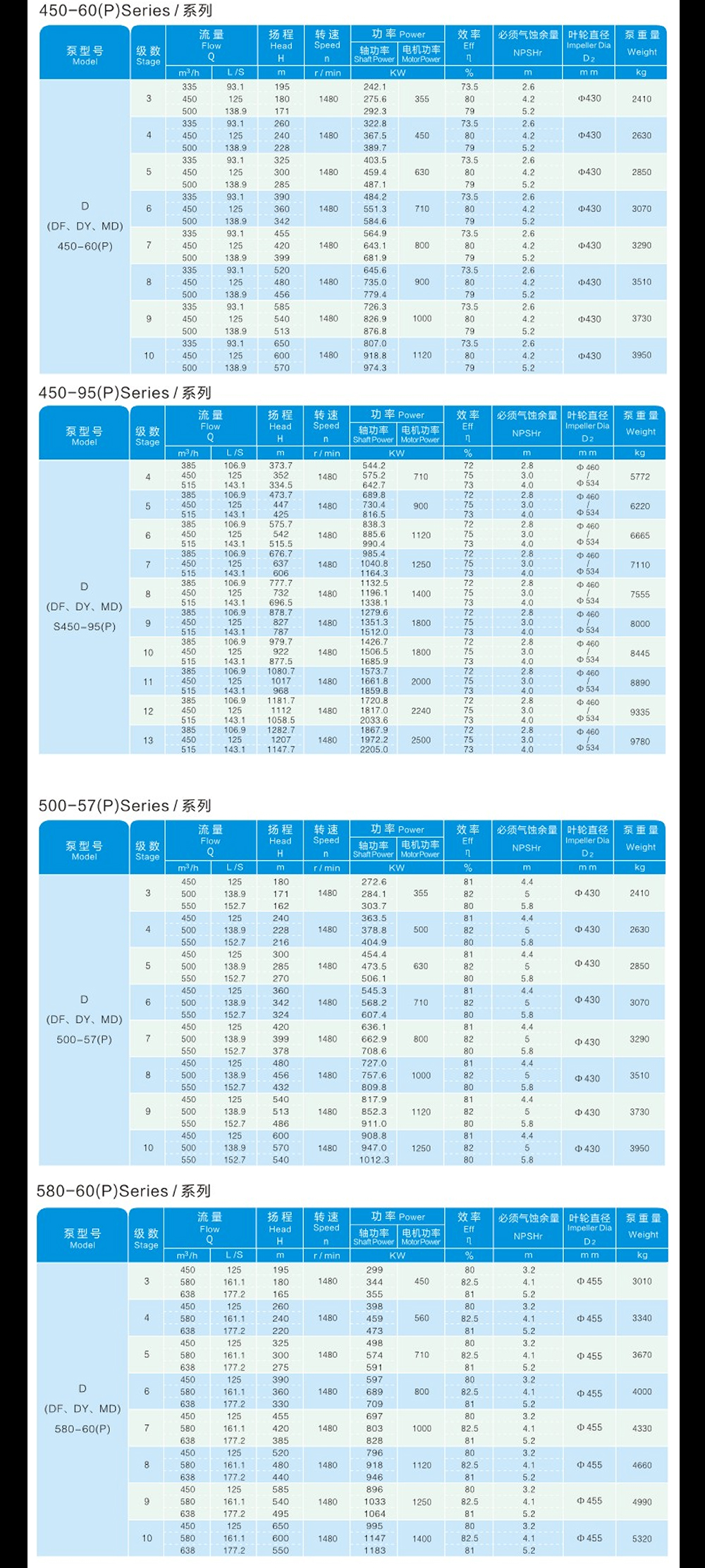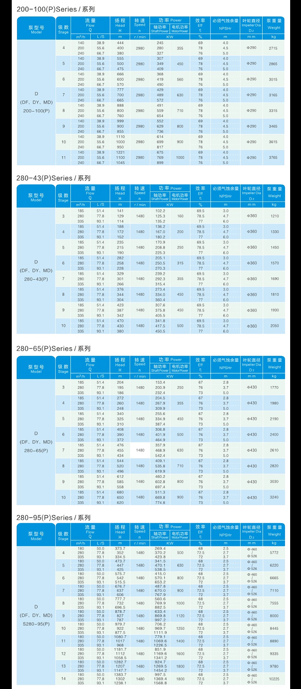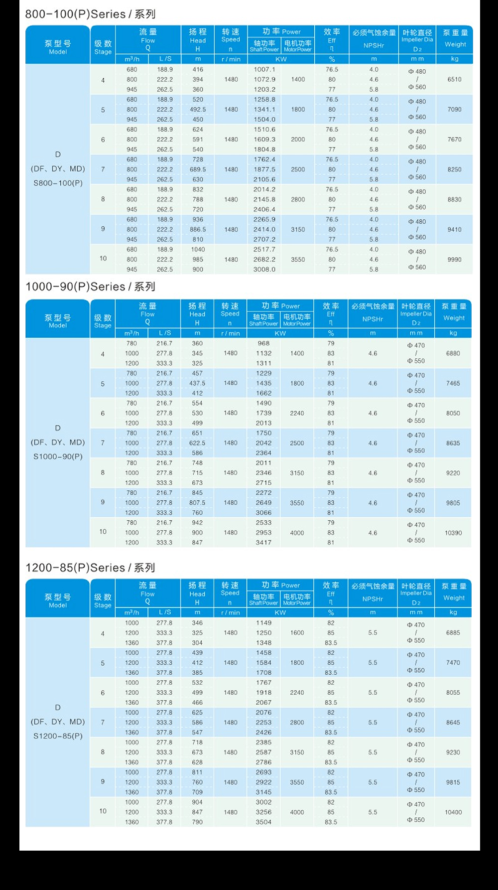 D(P)、DF(P)、DY(P)、MD(P)系列自平衡型離心泵,分為單吸多級(jí)機(jī)構(gòu)和雙吸多級(jí)機(jī)構(gòu),是我公司在D型單吸多級(jí)離心泵基礎(chǔ)上研制多年,開(kāi)發(fā)成功的產(chǎn)品。該系列產(chǎn)品高效區(qū)寬、氣蝕性能好、運(yùn)行平穩(wěn)、易損件少、可靠性大大提高,用戶維護(hù)成本大大降低,從而降低泵的壽命周期成本??晒┹斔筒缓腆w顆粒(磨料)、不含懸浮物的清水或物理化學(xué)性質(zhì)類似于清水的其它液體之用。也可通過(guò)改變泵的材質(zhì)(或泵過(guò)流部件的材質(zhì))、密封形式和增加冷卻系統(tǒng)用于輸送熱水、油類、腐蝕性或含磨料的介質(zhì)等。泵允許進(jìn)口壓力不大于0.6MPa 。