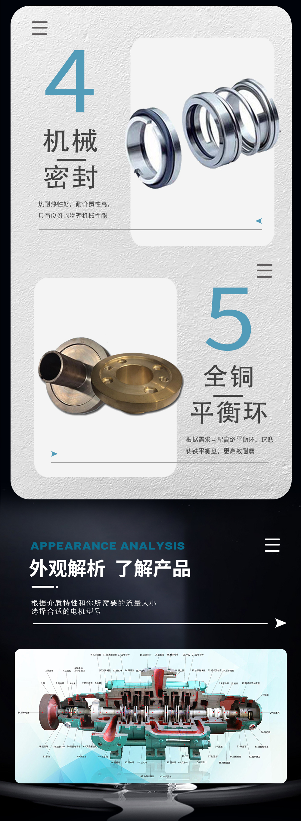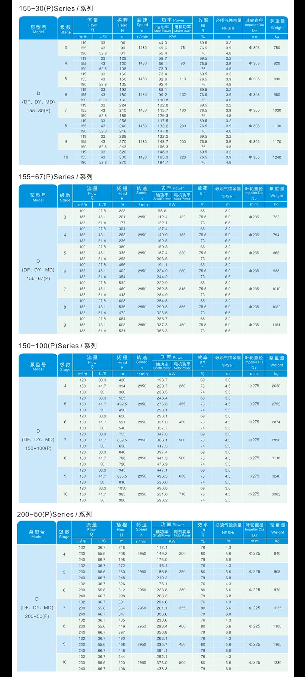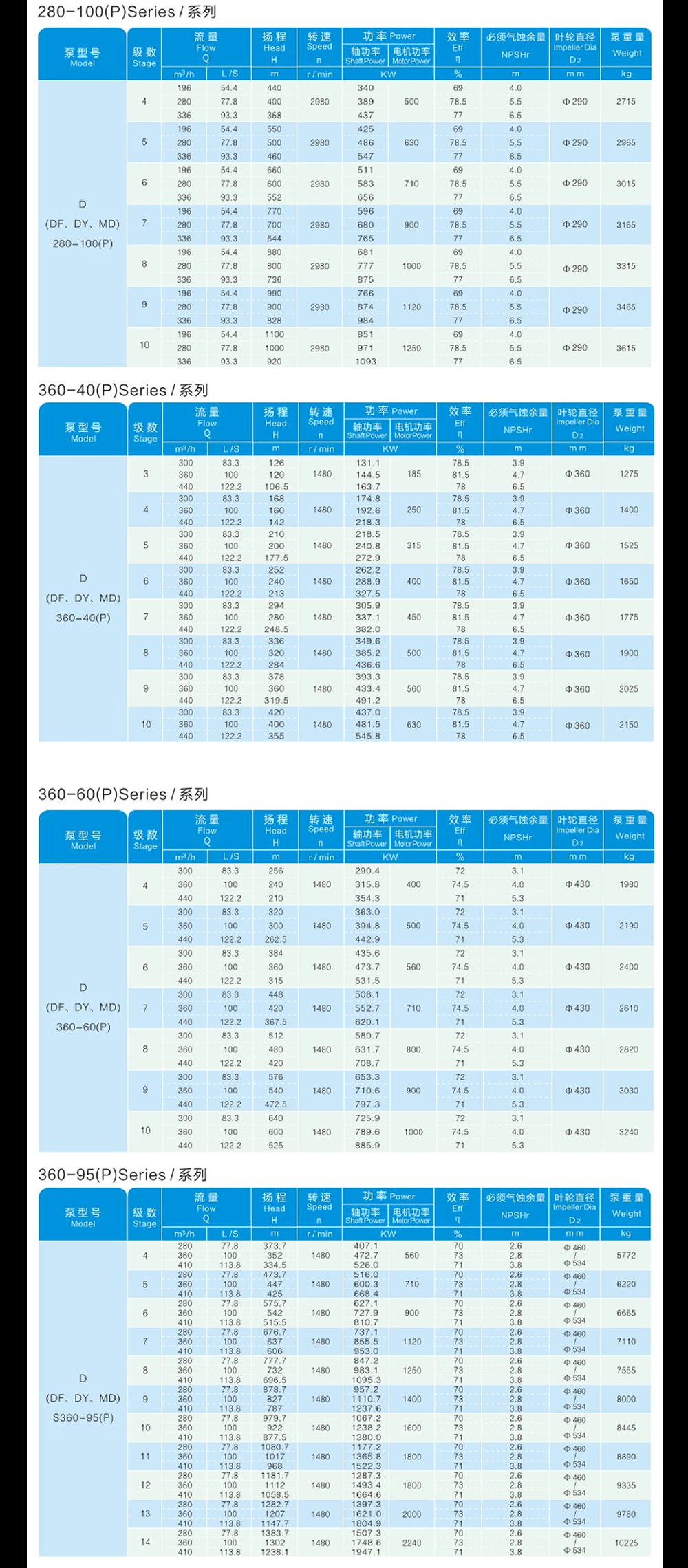 D(P)、DF(P)、DY(P)、MD(P)系列自平衡型離心泵,分為單吸多級(jí)機(jī)構(gòu)和雙吸多級(jí)機(jī)構(gòu),是我公司在D型單吸多級(jí)離心泵基礎(chǔ)上研制多年,開(kāi)發(fā)成功的產(chǎn)品。該系列產(chǎn)品高效區(qū)寬、氣蝕性能好、運(yùn)行平穩(wěn)、易損件少、可靠性大大提高,用戶維護(hù)成本大大降低,從而降低泵的壽命周期成本??晒┹斔筒缓腆w顆粒(磨料)、不含懸浮物的清水或物理化學(xué)性質(zhì)類似于清水的其它液體之用。也可通過(guò)改變泵的材質(zhì)(或泵過(guò)流部件的材質(zhì))、密封形式和增加冷卻系統(tǒng)用于輸送熱水、油類、腐蝕性或含磨料的介質(zhì)等。泵允許進(jìn)口壓力不大于0.6MPa 。