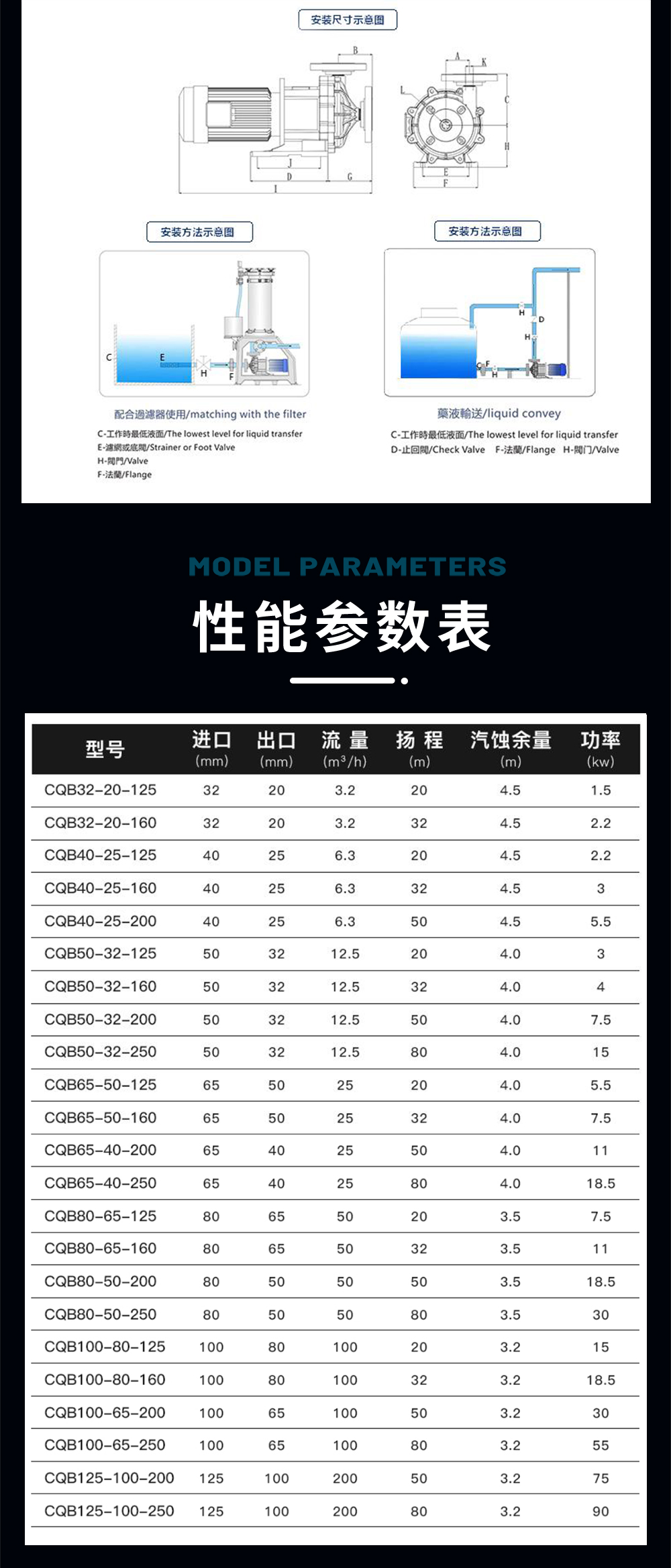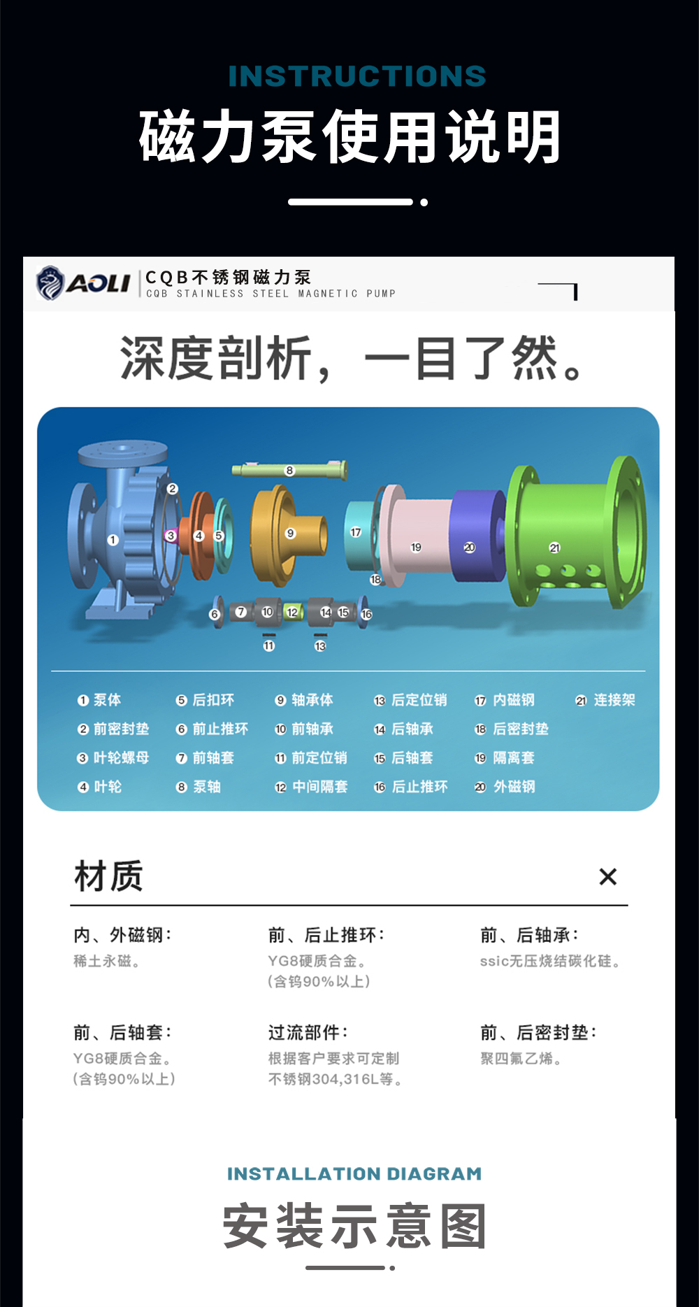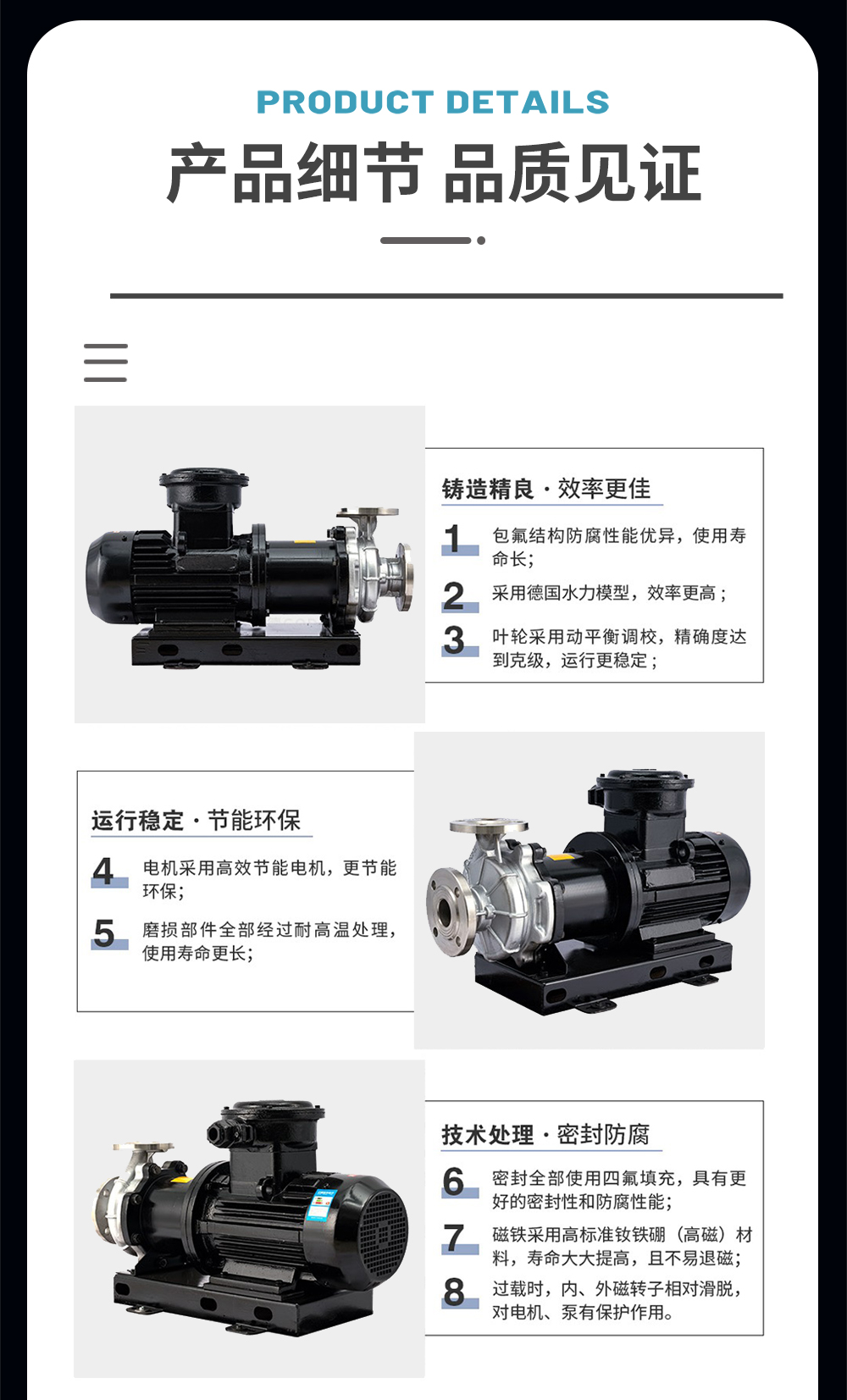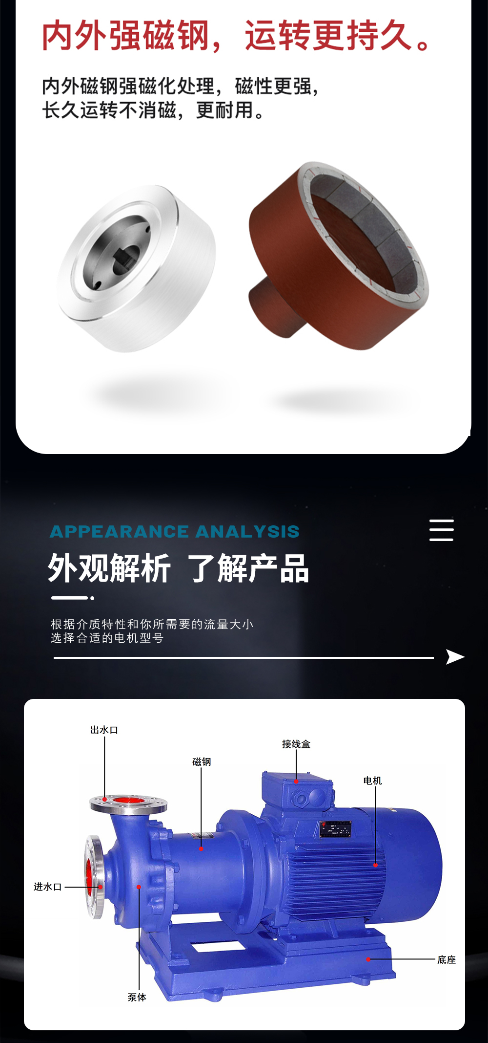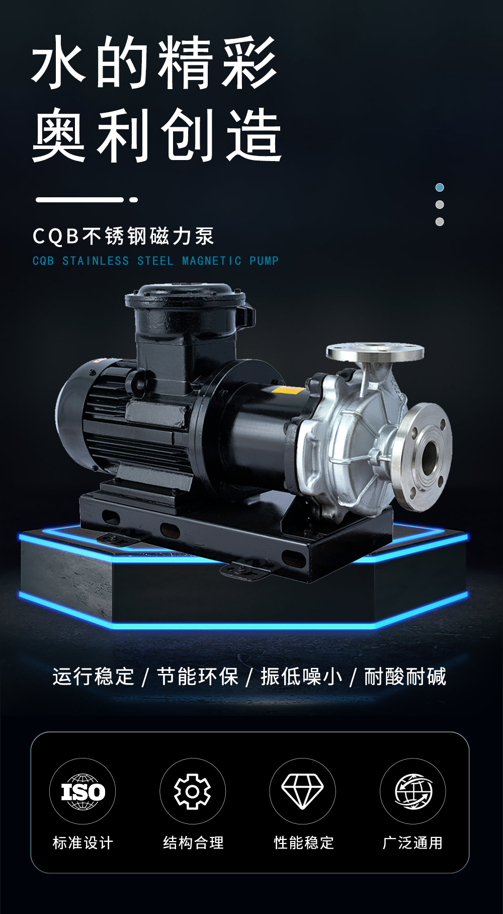 CQB不銹鋼磁力泵運用CFX、CFD相結合分析計算得到高性能的水力模型,過流部件采用304、316L等優(yōu)質不銹鋼材質,內、外磁轉子選用高磁能積、高矯頑力的稀土永磁制造,具有高效節(jié)能、介質適用面廣、耐高溫、磁性強、不退磁等優(yōu)點,是應用磁力耦合實現(xiàn)無接觸傳動、無動密封的新型高品質磁力傳動離心泵。全密封、無泄漏、清潔環(huán)保、運行靜音低振,是輸送易燃、易爆、腐蝕、貴重液體的首選用泵。因節(jié)能環(huán)保、可靠安全,并替代進口為用戶節(jié)約大量成本。廣泛應用于化工、制堿、石油、醫(yī)藥、衛(wèi)生、農藥、造紙、染料、污水處理等領域。