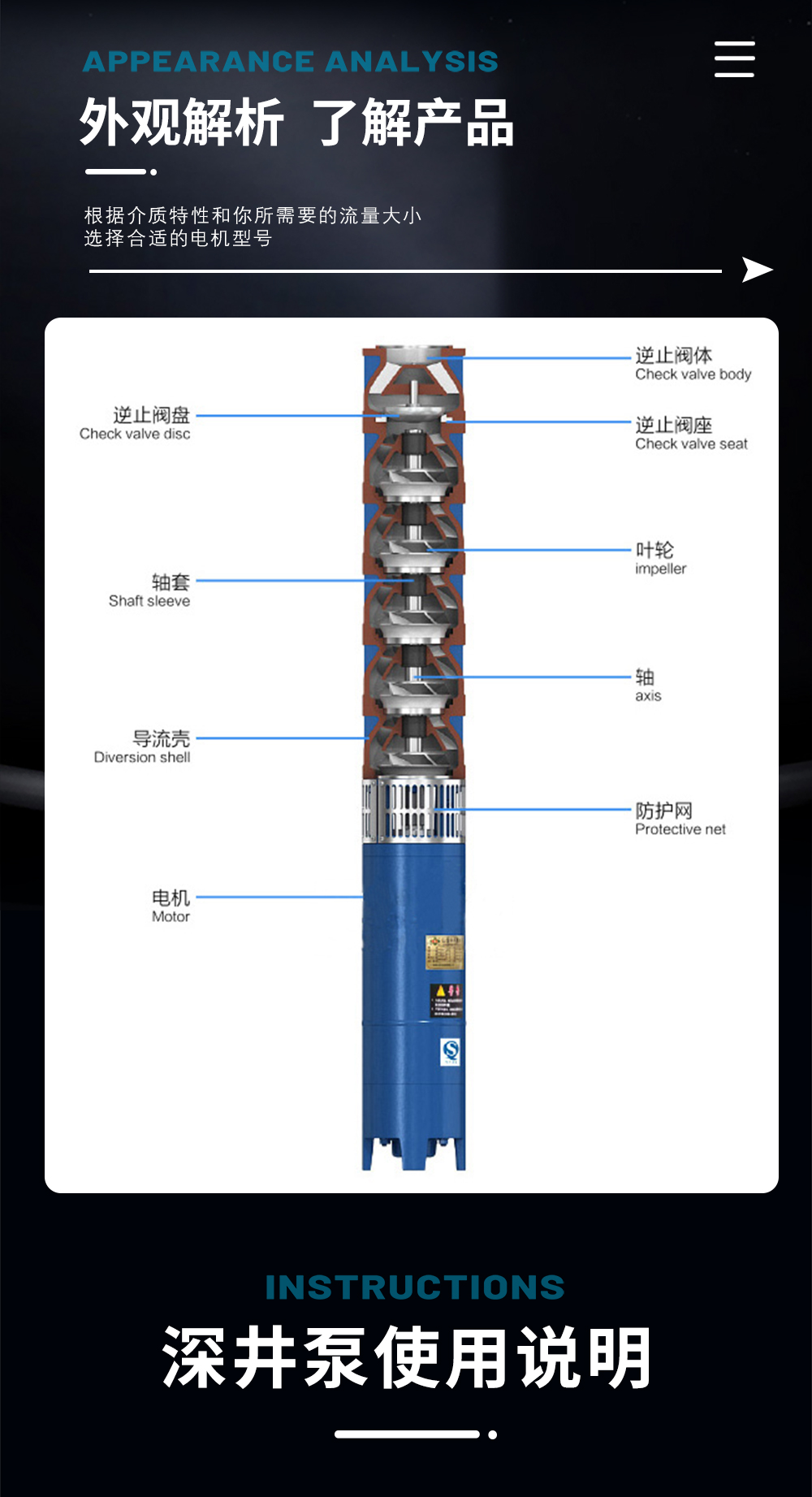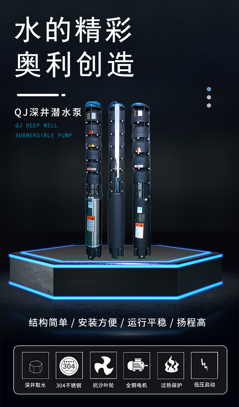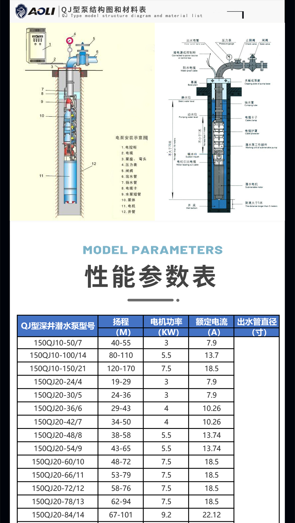QJ型深井泵是電機(jī)與水泵直聯(lián)一體潛入水中工作的提水機(jī)具,它適用于從深井提取地下水、也可用于河流、水庫、水渠等提水工程:主要用于農(nóng)田灌溉及高原山區(qū)的人畜用水,亦可供城市、工廠、鐵路、礦山、工地供排水使用。