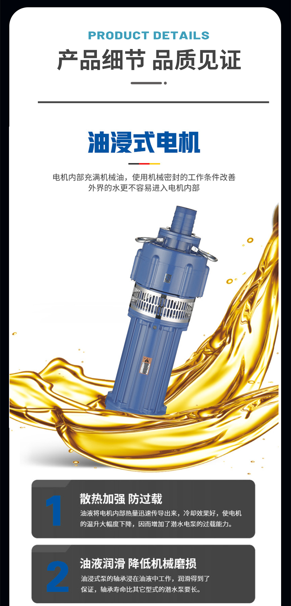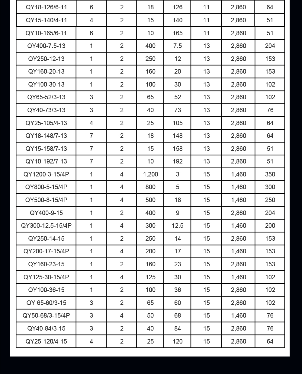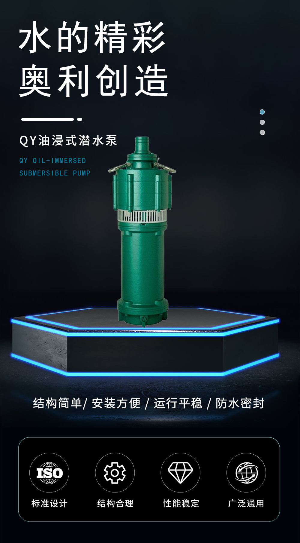 QY系列全揚(yáng)程油浸式潛水電泵由潛水電機(jī)、水泵、密封三部分組成。水泵位于產(chǎn)品上部,電機(jī)位于產(chǎn)品下端,該系列產(chǎn)品由于流量及揚(yáng)程適用范圍極廣,是廣大農(nóng)村、工礦企業(yè)廣泛使用的電力排灌設(shè)備,適用于農(nóng)業(yè)排灌、礦山排水、園林噴灌、井下提水、水塔進(jìn)水、城建用水等場(chǎng)合排水。