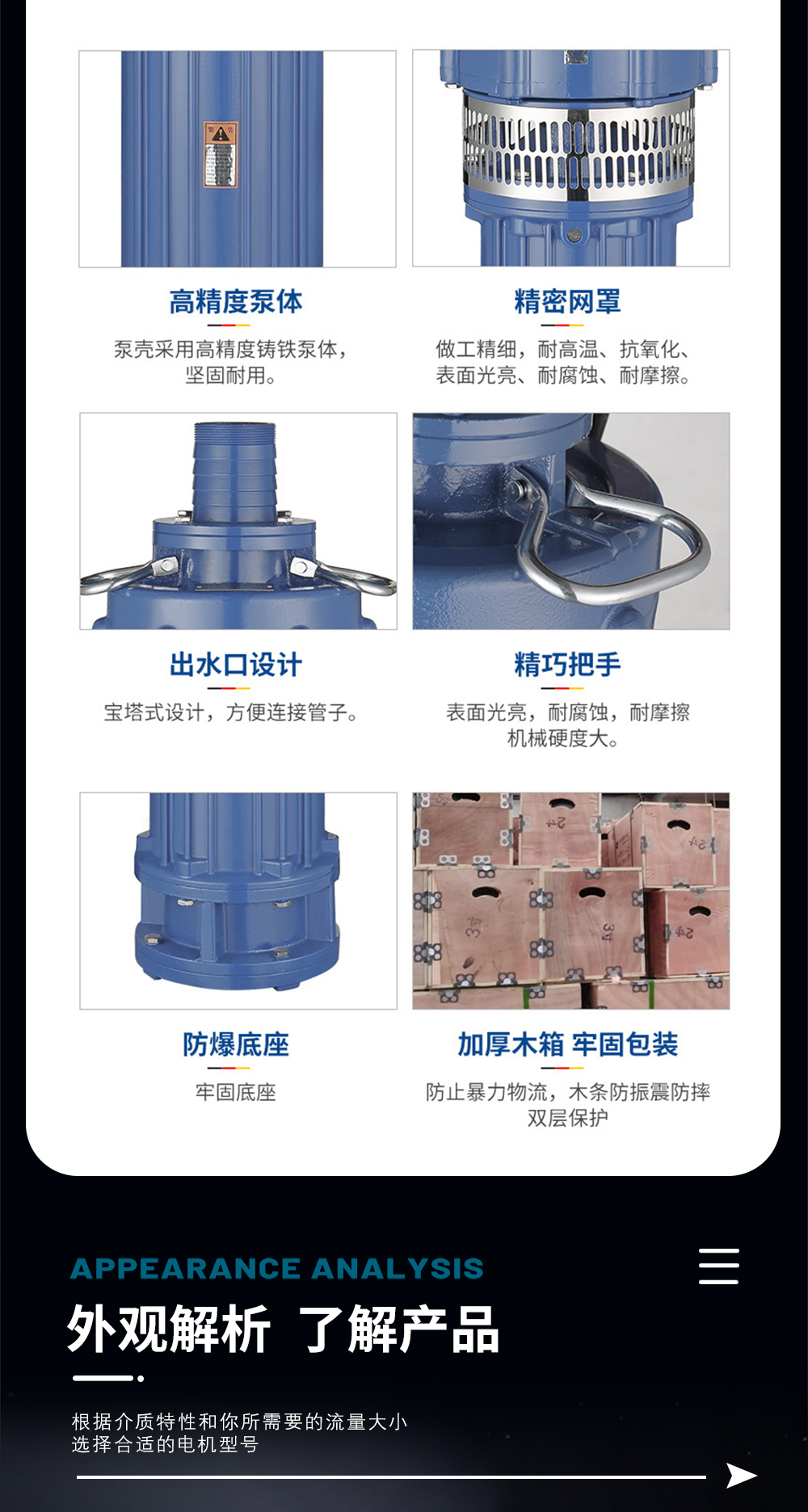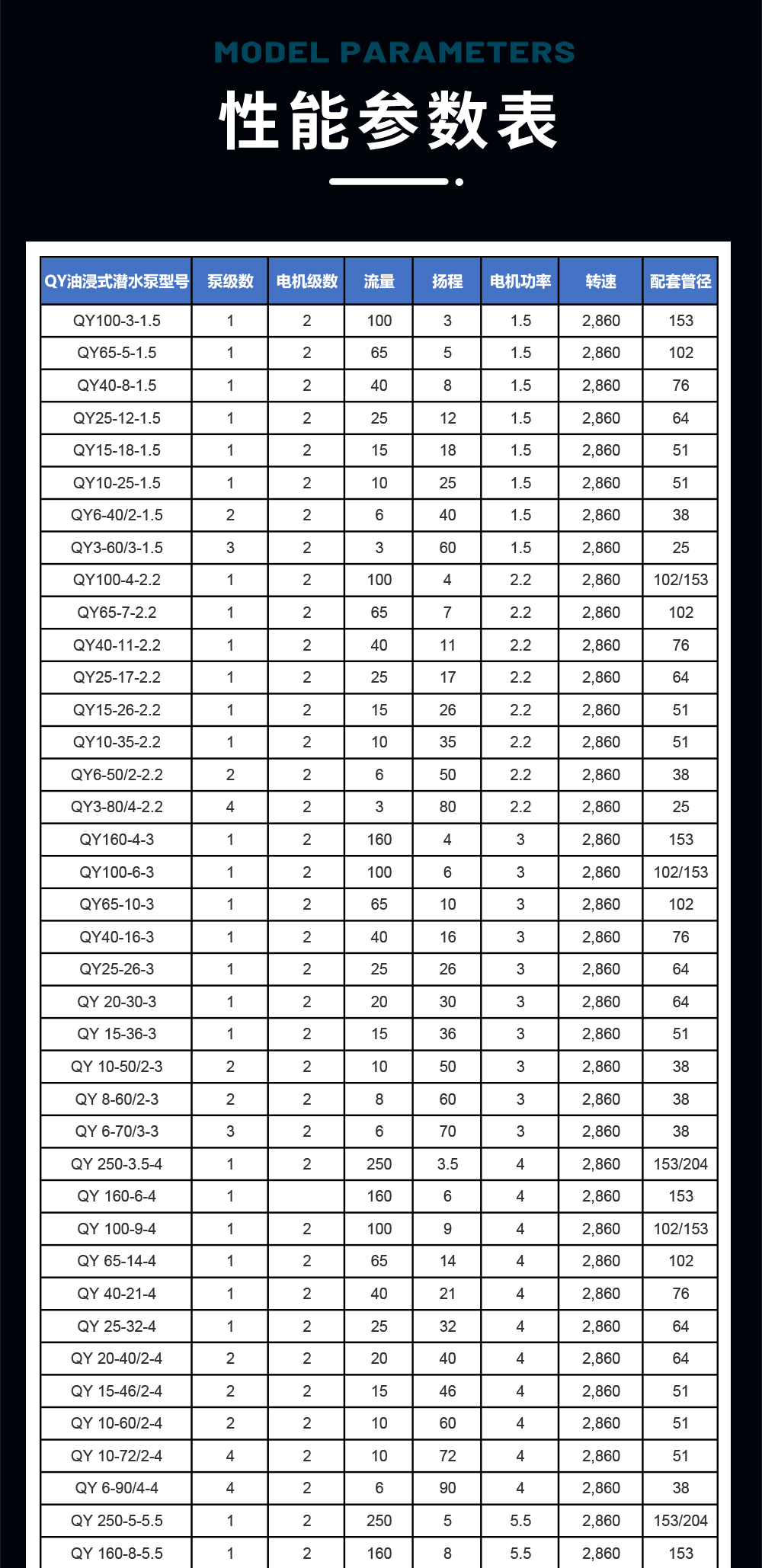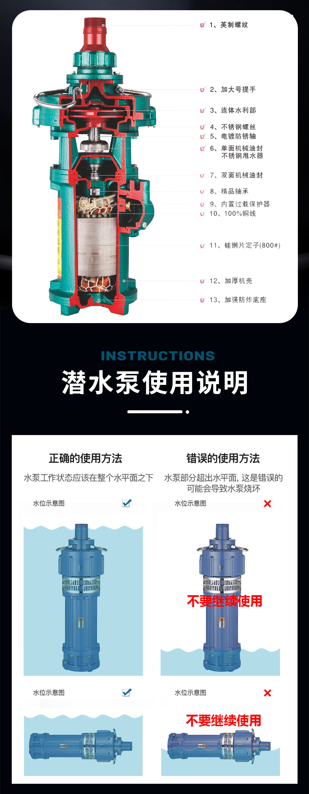 QY系列全揚(yáng)程油浸式潛水電泵由潛水電機(jī)、水泵、密封三部分組成。水泵位于產(chǎn)品上部,電機(jī)位于產(chǎn)品下端,該系列產(chǎn)品由于流量及揚(yáng)程適用范圍極廣,是廣大農(nóng)村、工礦企業(yè)廣泛使用的電力排灌設(shè)備,適用于農(nóng)業(yè)排灌、礦山排水、園林噴灌、井下提水、水塔進(jìn)水、城建用水等場(chǎng)合排水。