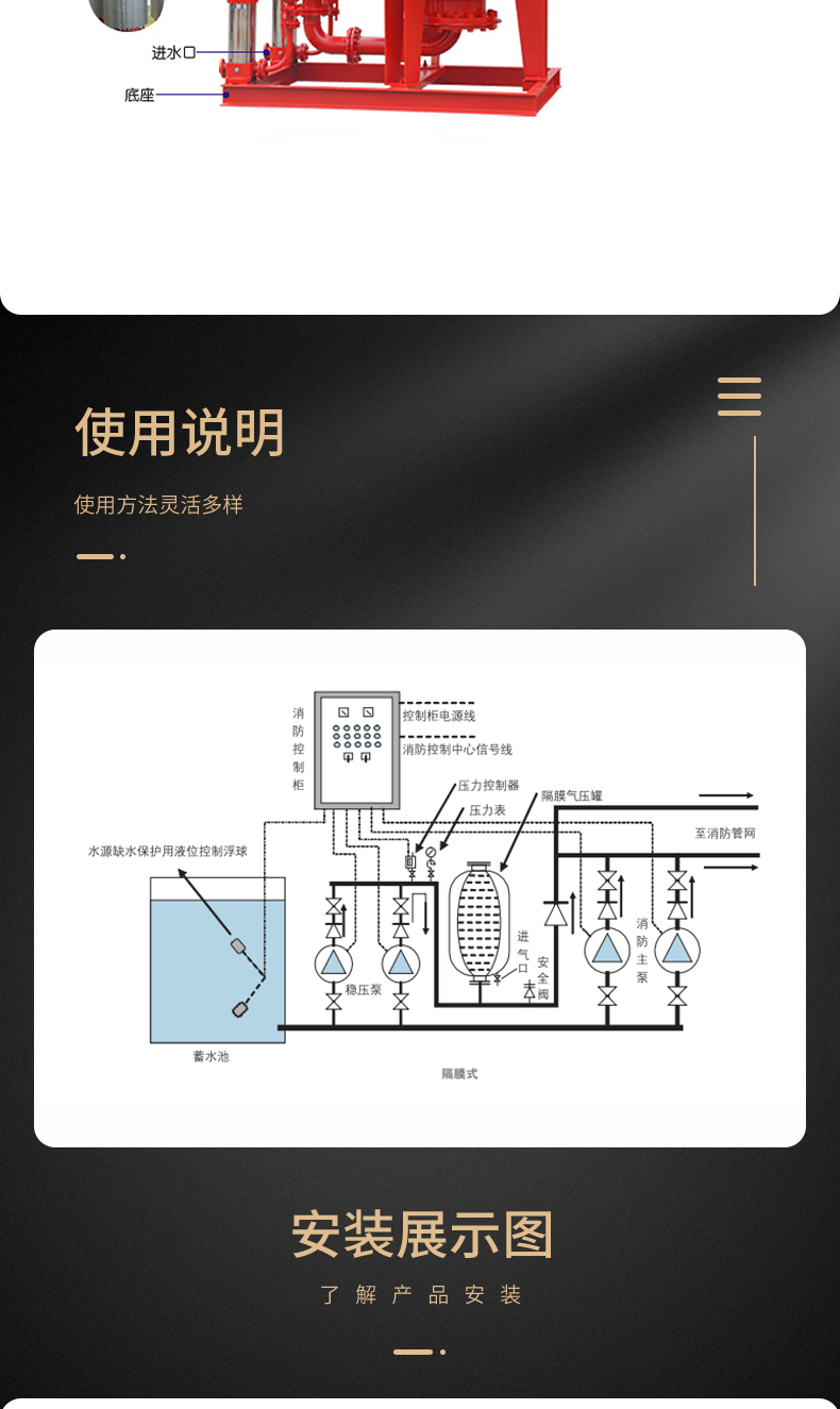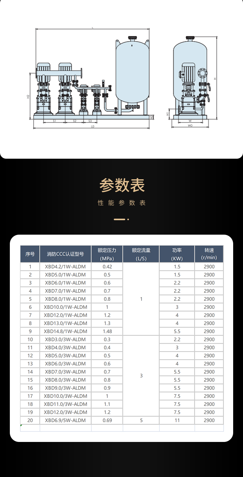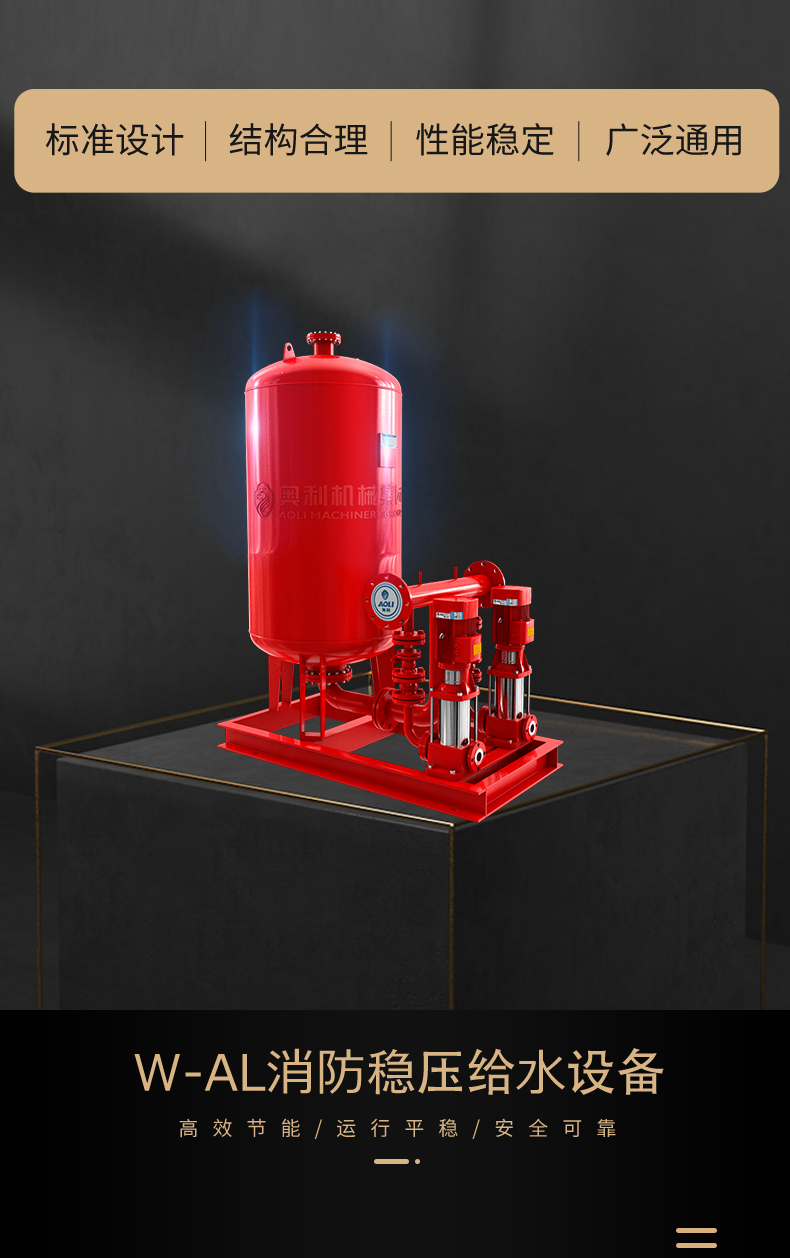 W-AL消防穩(wěn)壓給水設(shè)備是利用食品級橡膠作為氣水隔離的新型設(shè)備,一次充氣,常年運行使用。通過電接點壓力表和電控箱控制水泵運行,達到額定的壓力和連續(xù)供水。是按照國家消防設(shè)計規(guī)范GB50016《建筑設(shè)計防火規(guī)范》及國家標(biāo)準(zhǔn) GB27898.3《固定消防給水設(shè)備第四部分∶ 消防增壓穩(wěn)壓給水設(shè)備》設(shè)計、制造的消防專用的增壓穩(wěn)壓設(shè)備。該設(shè)備由隔膜式氣壓罐、增壓泵、電控箱、儀表和管路附件等組成,適用于多層和高層建筑工程有增壓要求的消火栓給水系統(tǒng)及自動噴水滅火系統(tǒng)等各類消防給水系統(tǒng)。