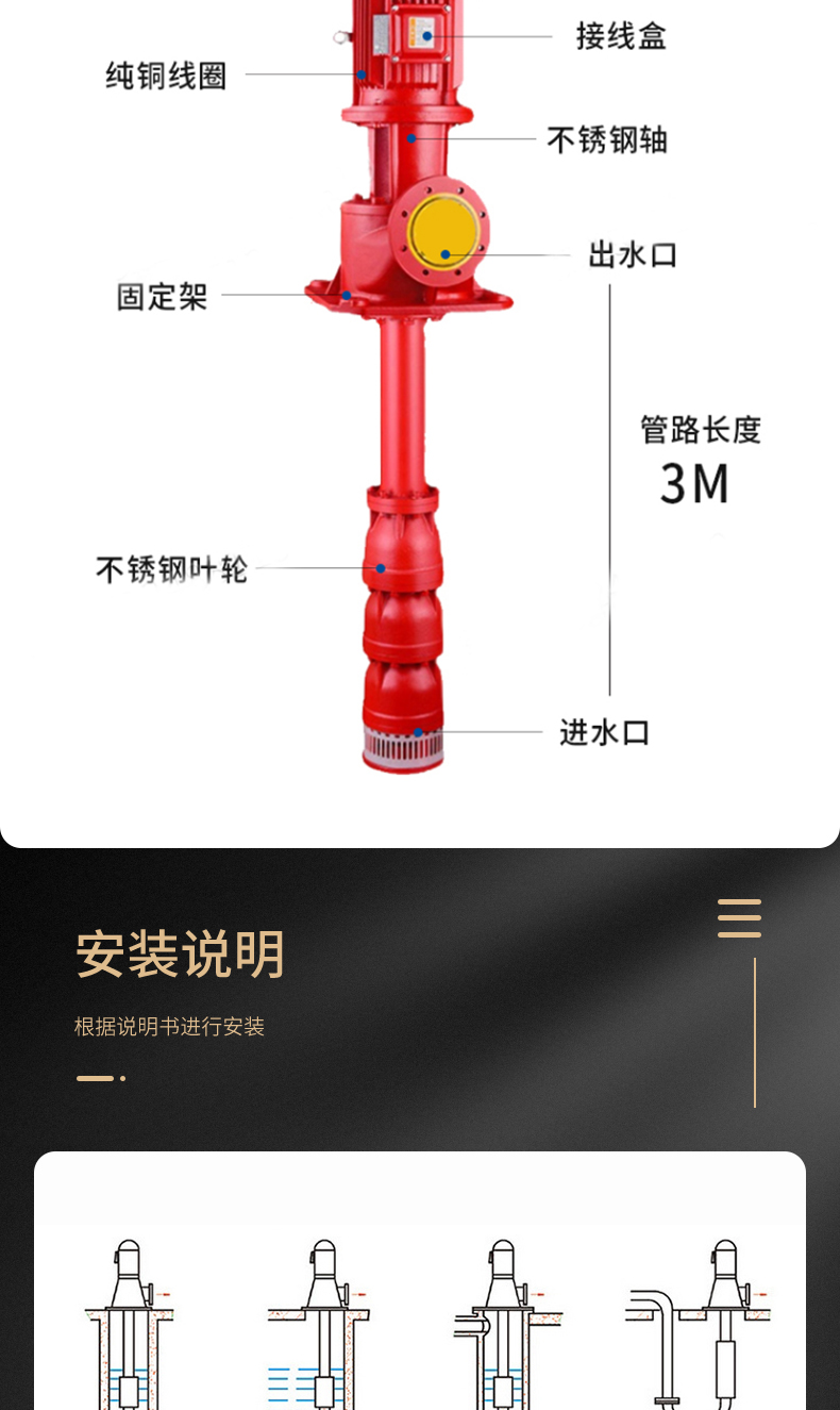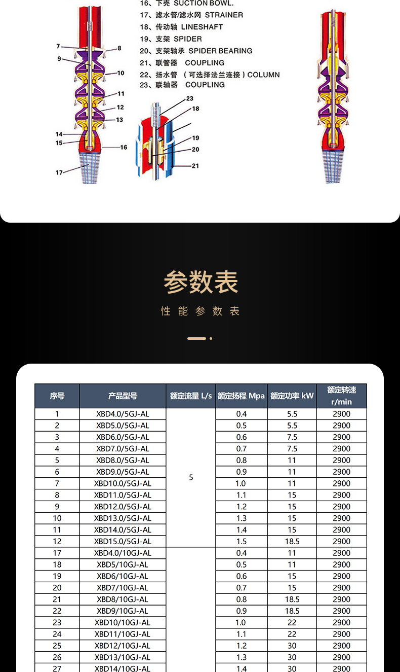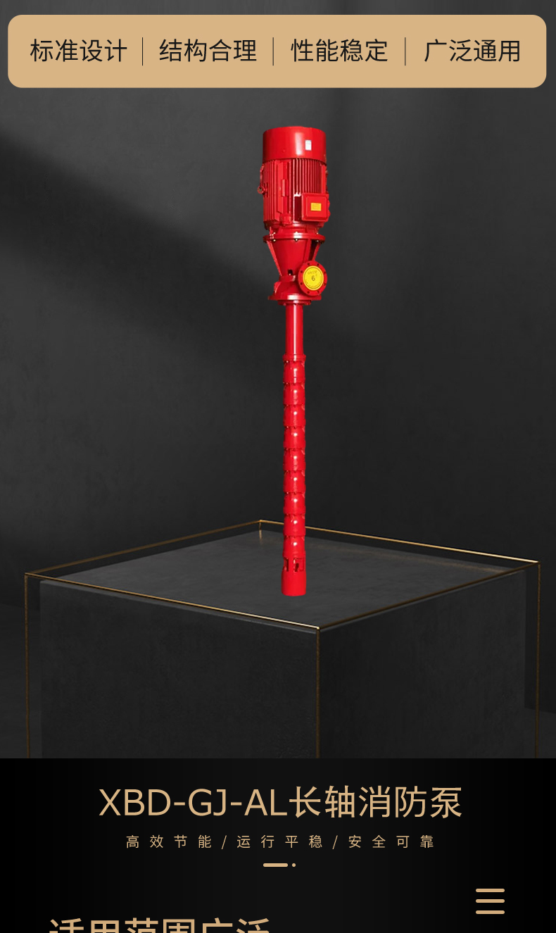 XBD-GJ長軸深井消防泵是按照中國新消防泵新標(biāo)準(zhǔn)GB6245-2006《消防泵性能要求和試驗(yàn)方法》和美國消防協(xié)會(huì)標(biāo)準(zhǔn)NFPA20引進(jìn)開發(fā)的消防泵。產(chǎn)品經(jīng)中國消防裝備質(zhì)量監(jiān)督測(cè)試中心型式試驗(yàn),各項(xiàng)性能指標(biāo)全部達(dá)到標(biāo)準(zhǔn)要求,獲得消防產(chǎn)品認(rèn)可證書。長軸消防泵由多個(gè)離心式葉輪和導(dǎo)流殼、揚(yáng)水管、傳動(dòng)軸、泵座、電動(dòng)機(jī)等部件組成。泵座和電機(jī)位于水池上方,電動(dòng)機(jī)的動(dòng)力通過與揚(yáng)水管同心的傳動(dòng)軸傳遞給葉輪軸,從而產(chǎn)生流量和壓力。